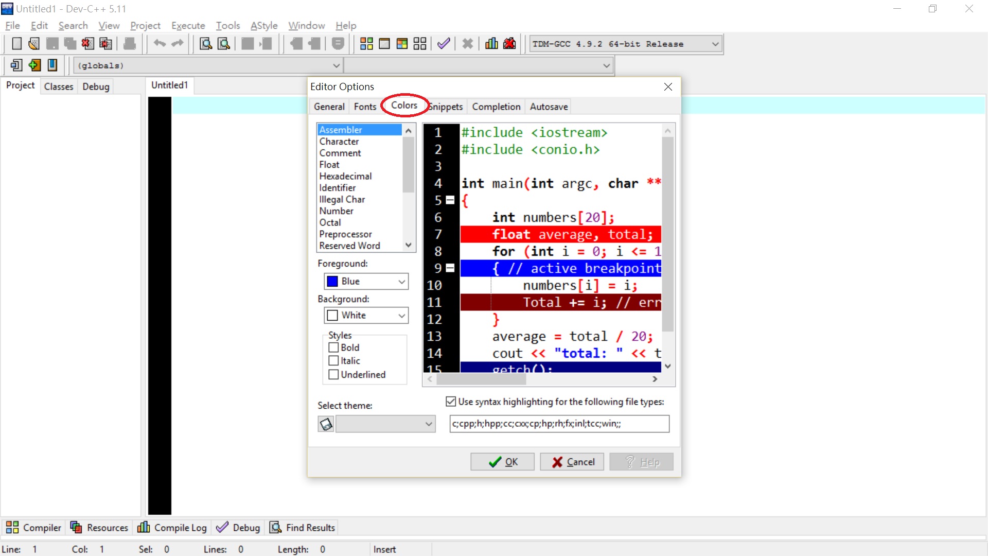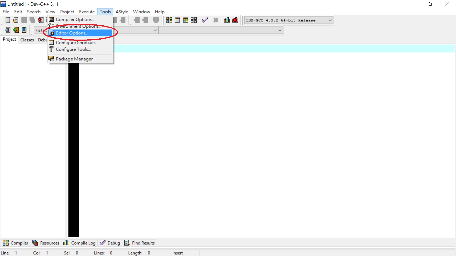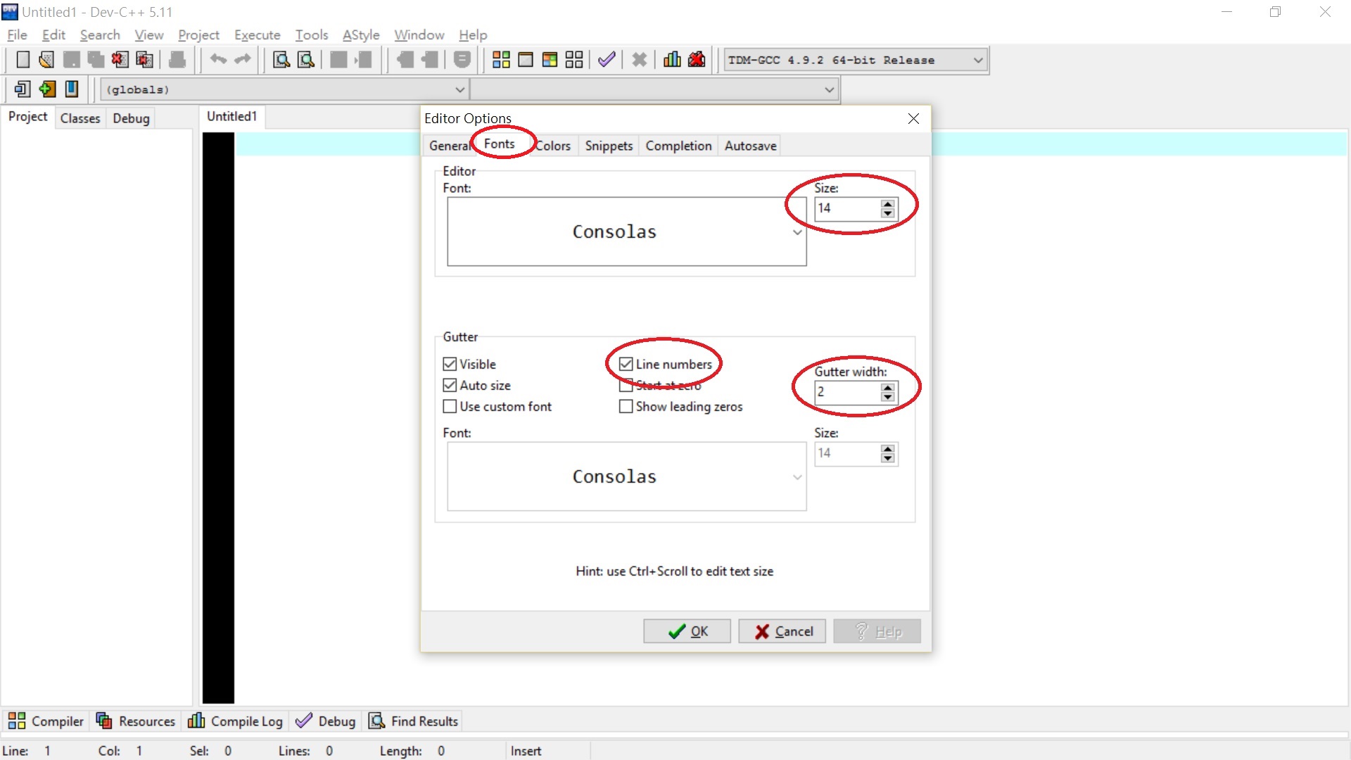 The Dev-C++ will pop up a window allows you to customize the editor window. In the "Fonts" page, we can modify the font size and enable the line numbers of the editor.