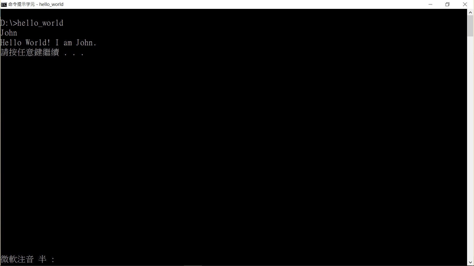 When run program hello_world, it will wait for the user to enter a string, e.g., John, and then outputs a string Hello World! I am John. We have shown a simple program performing an input and an output operations. More study of C programming language and program design will be discussed in the course material.
