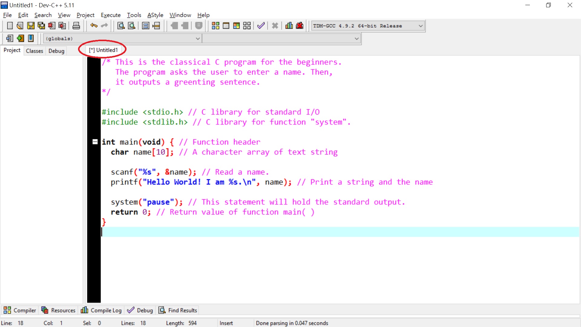 When we develop a software program, we must write the program using a software tool. Usually, there are two important tools are needed. The first tool is an editor on which we can enter the program text. Basically, any text editor, e.g., Microsoft Note and Ultra Editor will do the job. The program text is usually an English text which is not understood by a CPU. Then, another tool is a compiler which will be translated the programming text into a sequence of codes that a CPU can understand, i.e., can execute. Examples of compilers for C programming language are GNU C, Microsoft Visual C++, Turbo C++. In fact, a tool like Microsoft Visual C++ is a combination of an editor and a compiler. In this course we will use a free software tool called Dev-C++ by Bloodshed Software. Dev-C++ is also a tool consisted of an editor and a compiler, GNU C/C++ compiler.